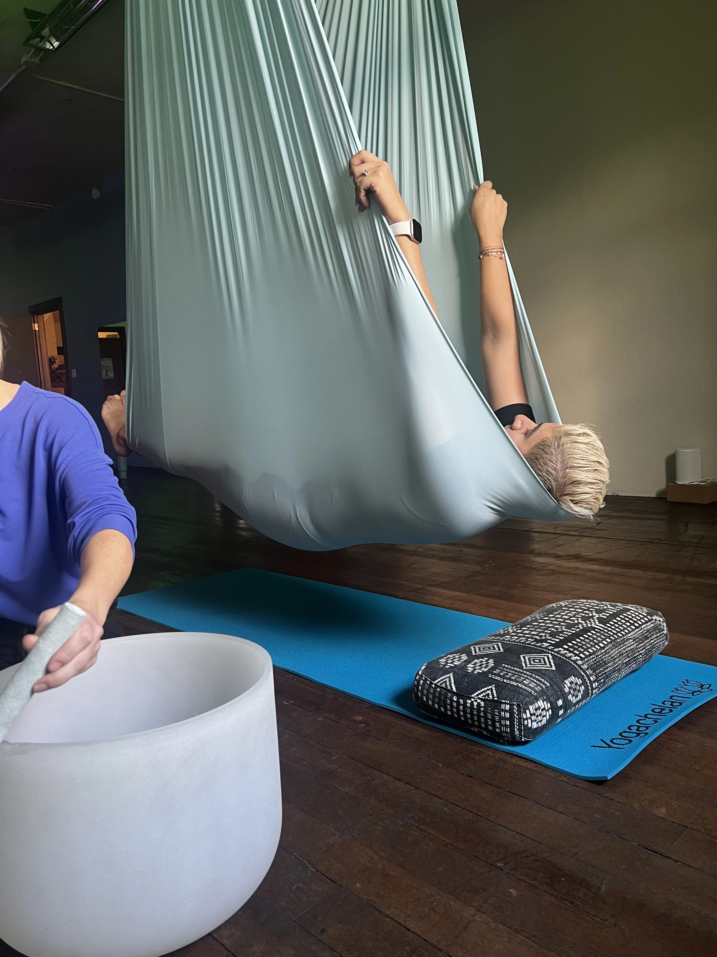 Let yourself be held, both by the silks and by sound. This deeply restorative experience blends the gentle support of Aerial Yoga with the soothing resonance of sound healing, creating space to release tension, calm the mind, and restore energetic balance.